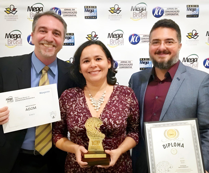 Na imagem estão pela primeira vez os representantes da AD2M recendo o prêmio Top Mega Brasil de Comunicação Corporativa, em 2015, em São Paulo.