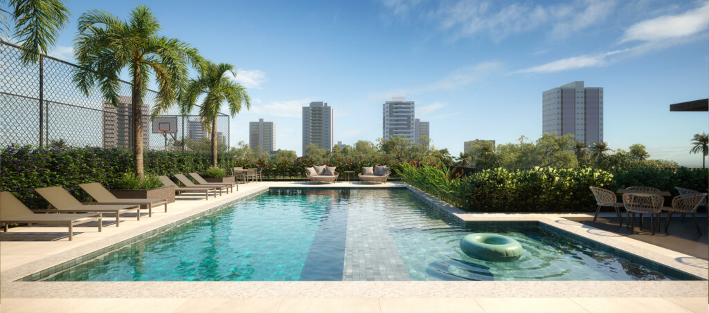 Entre os destaques estão piscina adulto e infantil, prainha, quadra recreativa, academia, salão gourmet, salão de festas, brinquedoteca, pet place, mercado autônomo e áreas de convivência que valorizam o bem-estar e a experiência do morar.