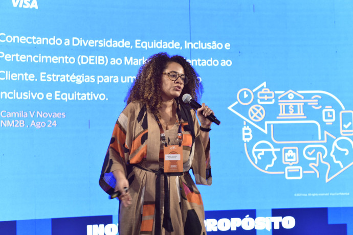 Camila Novaes finalizou o primeiro dia NM2B, realizado nesta terça-feira (7), no La Maison, em Fortaleza (CE). A diretora de marketing e líder de inclusão e diversidade da Visa apresentou os principais cases com ações para a diversidade, equidade e inclusão de pessoas pretas em ambientes corporativos e educacionais.