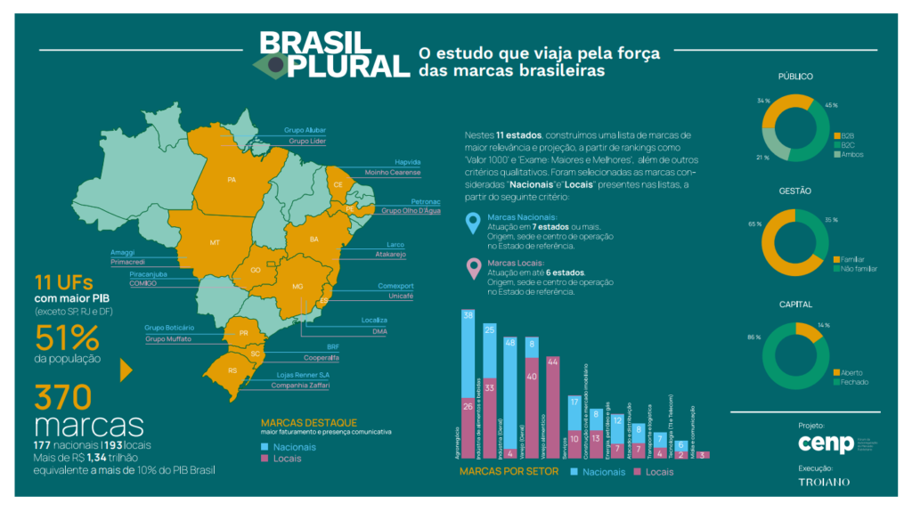 Conduzido pela Troiano Branding, o levantamento, que não é um mapeamento de lembrança espontânea, mas sim de impacto econômico e cultural, chegou a 370 marcas, sendo 193 de atuação local e 177 de atuação nacional, selecionadas a partir de rankings de faturamento e premiações nacionais. Juntas, essas companhias movimentam mais de R$ 1,34 trilhão, o equivalente a mais de 10% do PIB nacional, evidenciando a relevância do mapeamento.