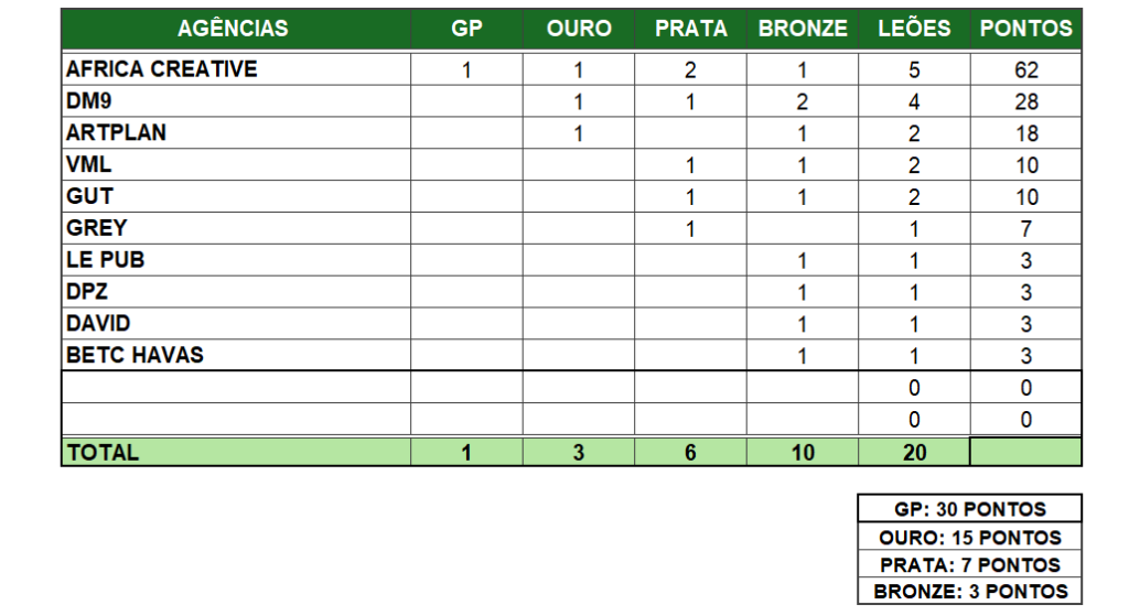 Com um total de 20 prêmios, as agências Africa Creative, DM9, Artplan, VML, GUT, GREY, Le Pub. DPZ, David e BETC HAVAS, destacaram o Brasil na premiação