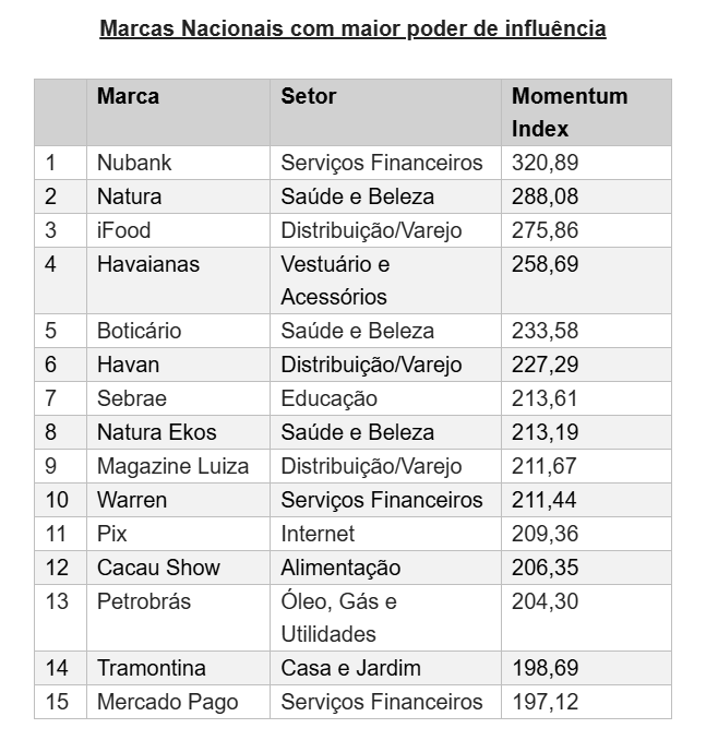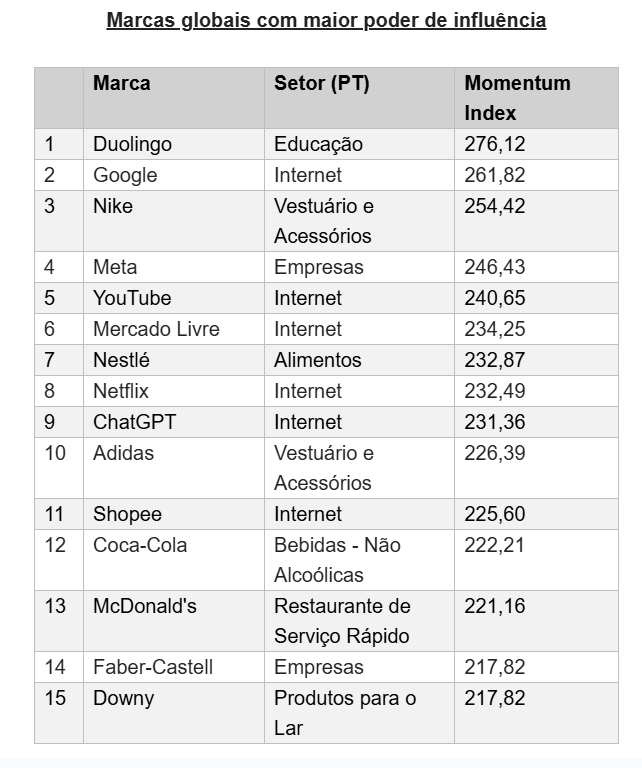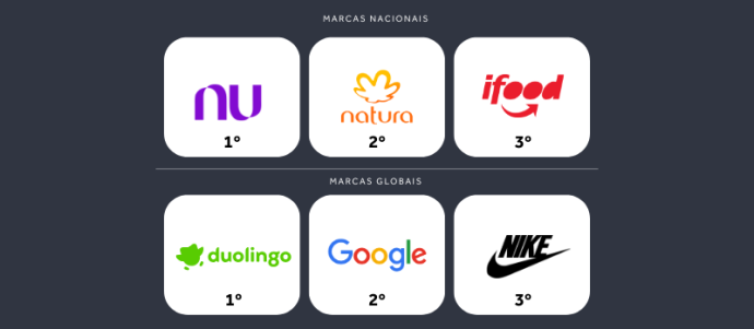 Em âmbito nacional as marcas Nubank, Natura e IFood lideram; enquanto globalmente as marcas que despontam são: Duolingo, Google e Nike