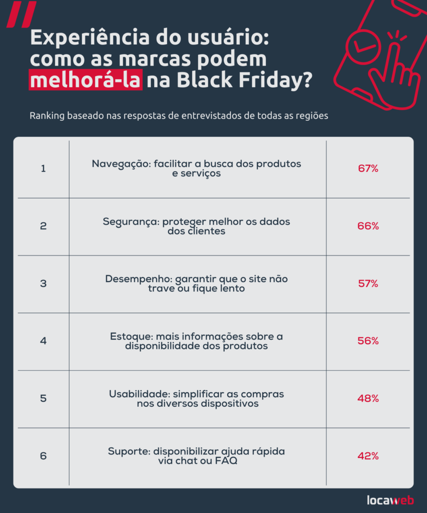 De toda maneira, vale destacar que a mera existência do site, por si só, não será suficiente durante a época de ofertas. Para garantir uma boa jornada de compra, os respondentes apontaram como essenciais uma navegação fácil e intuitiva (67%), certa segurança no tratamento dos dados pessoais, validada por selos e certificados SSL (66%), e o desempenho estável da plataforma (57%), evitando lentidão nos momentos de maior movimento.
