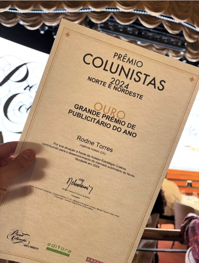 “É uma honra ser reconhecido como Publicitário do Ano N/NE pelo 57º Prêmio Colunistas Brasil, o mais tradicional da publicidade nacional. Este prêmio celebra a força coletiva da Acesso Estratégia Criativa, também evidenciada pelo Ouro conquistado para o cliente São Geraldo, ao lado dos principais nomes da indústria. Meu agradecimento sincero à equipe excepcional, aos clientes que nos desafiam e aos parceiros que materializam ideias. Juntos, transformamos a criatividade em resultados tangíveis e conquistas expressivas”, comemora Rodne.