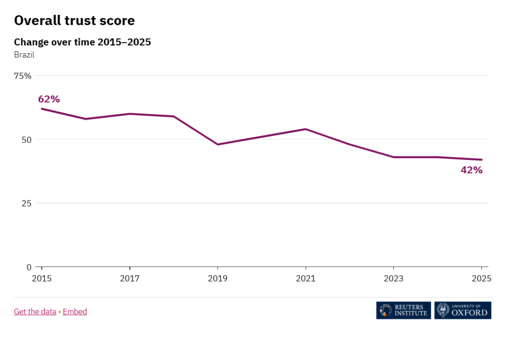 Segundo o mesmo levantamento, a confiança nas notícias parece ter se estabelecido em um “novo normal”, com níveis estáveis nos últimos três anos. Em 2025, o percentual atingiu os 42%, uma queda de 20 pontos comparada ao período de 10 anos atrás, quando a opinião pública confiava em 62% do que era veiculado. O motivo para a queda brusca seria o aumento da polarização política a partir dos anos seguintes.