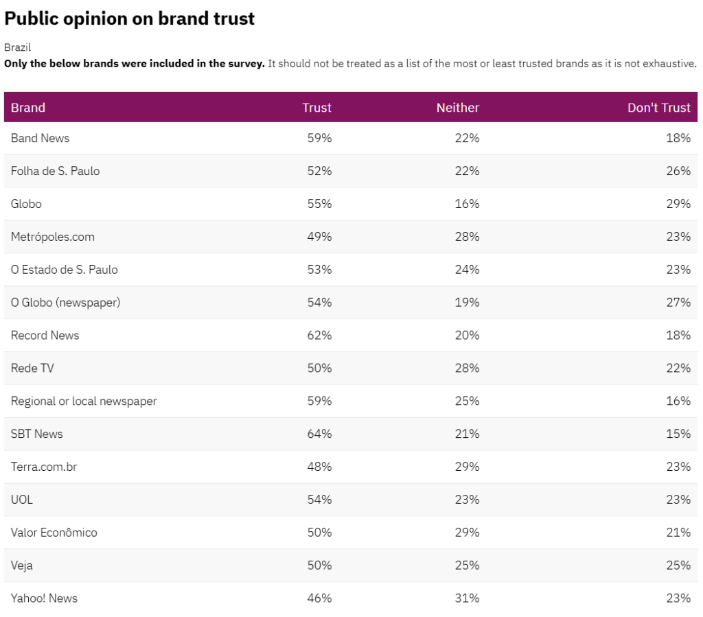 Publicado na última terça-feira (17) pelo Instituto Reuters junto à Universidade de Oxford, o estudo Digital News Report 2025 elencou quais foram as marcas de maior confiança junto à opinião pública. Entre as 15 marcas de jornalismo do Brasil listadas, o SBT News obteve mais alto índice de confiança (64%), seguido pela Record News (62%) e a Band News (59%). A marca gerida pela Família Abravanel obteve também o menor índice de desconfiança (15%). Confira a lista de confiança, em ordem alfabética, abaixo: