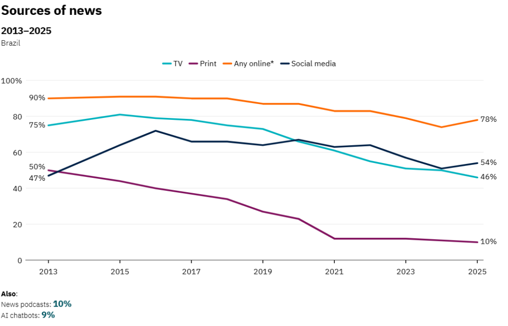 O consumo de notícias na televisão e, especialmente, na mídia impressa, diminuiu significativamente na última década. Chatbots de IA são usados por 9% dos brasileiros para receber notícias e podcasts (10%).