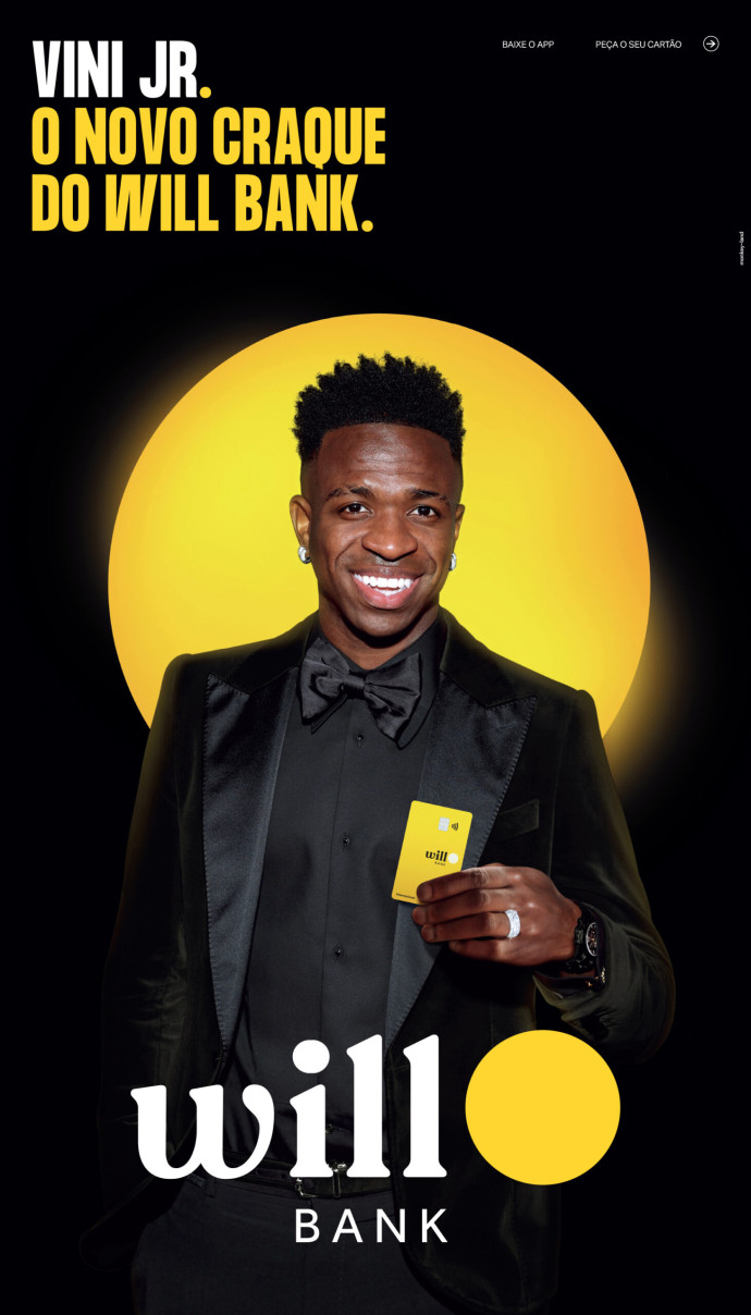 A novidade foi revelada em uma sequência de cinco anúncios ao jornal Valor Econômico, em uma campanha criada pela agência Monkey-Land. Com título “Um dos maiores craques do mundo foi pro banco. Vini Jr. O novo craque do will bank”, a comunicação brinca com a situação de Vini Jr. ter ido para o banco mais completo do Brasil, e não para o banco de reservas.